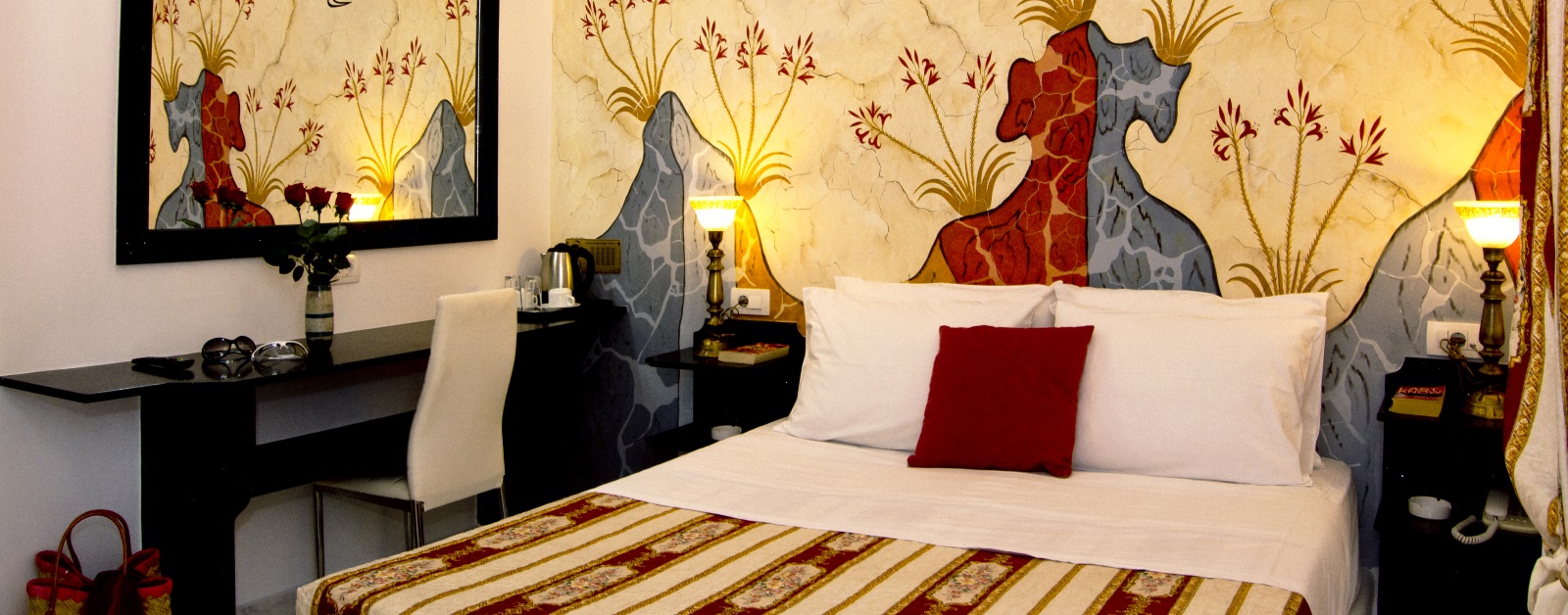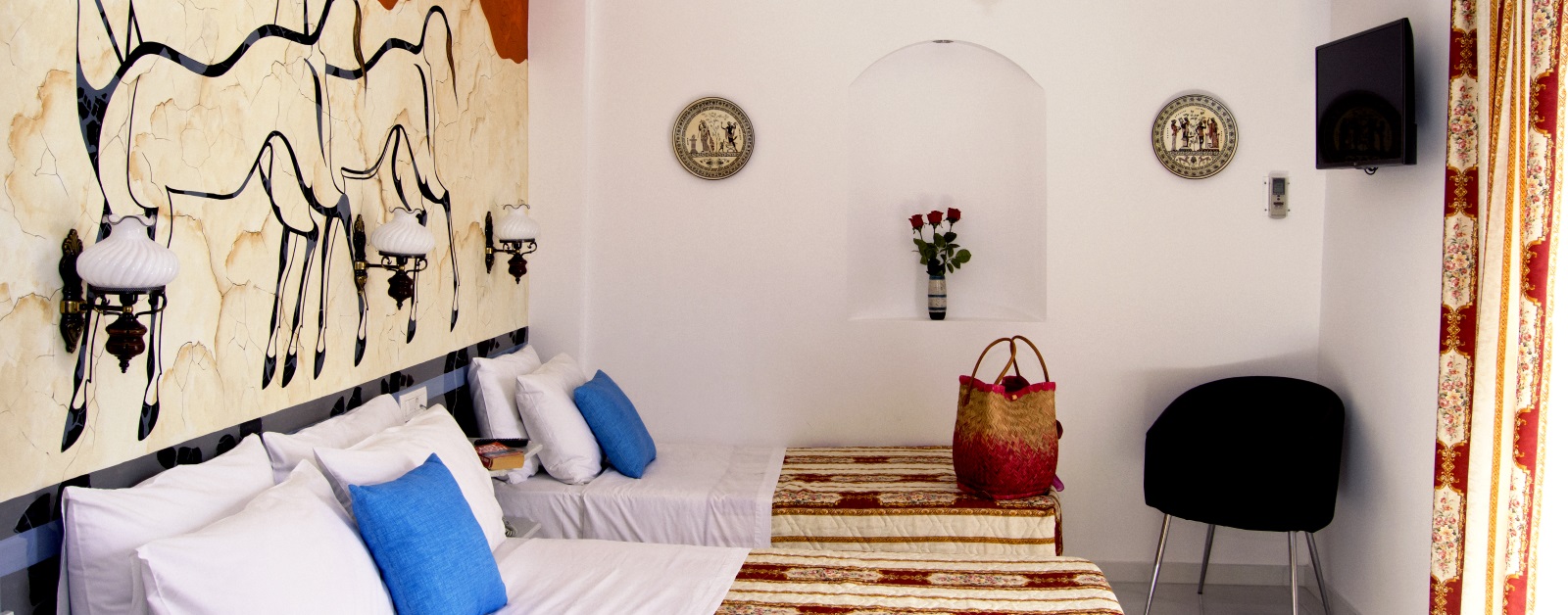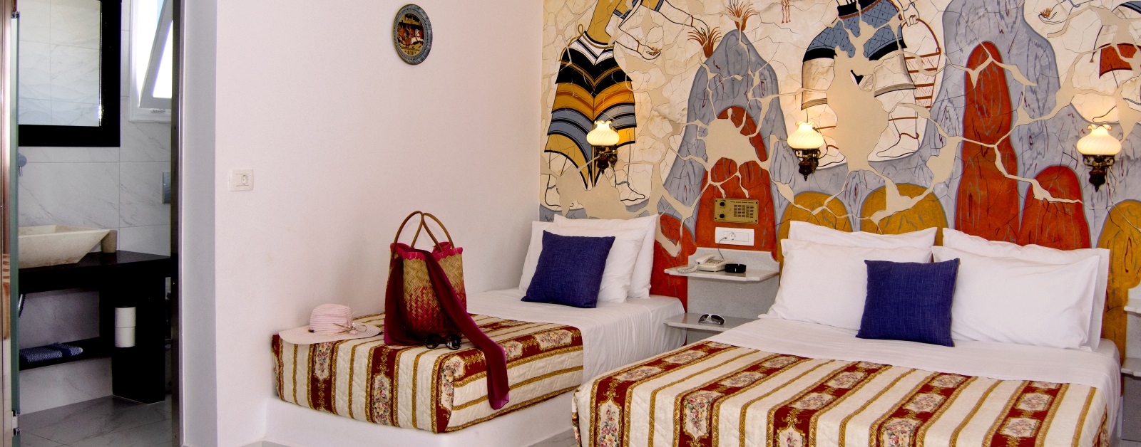 All the rooms are decorated with local paintings, creating many different types of accommodation. They are also equipped with marble furniture. From their private terraces, the guests have the opportunity to enjoy the panoramic views that make up the village of Perissa, the sea, the pool and the hotel's leafy garden.